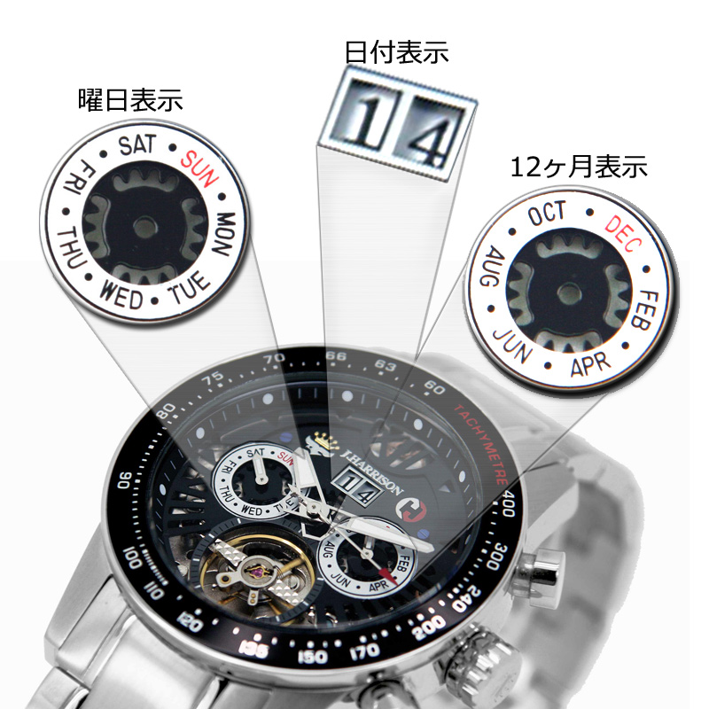 (9時位置:曜日表示、3時位置:月表示)