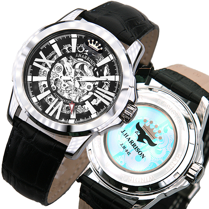ムーブメントを透かしたデザインに加えて、ステッチ入りの皮ベルトなどで高品質なバックル等で高級感を演出しています、