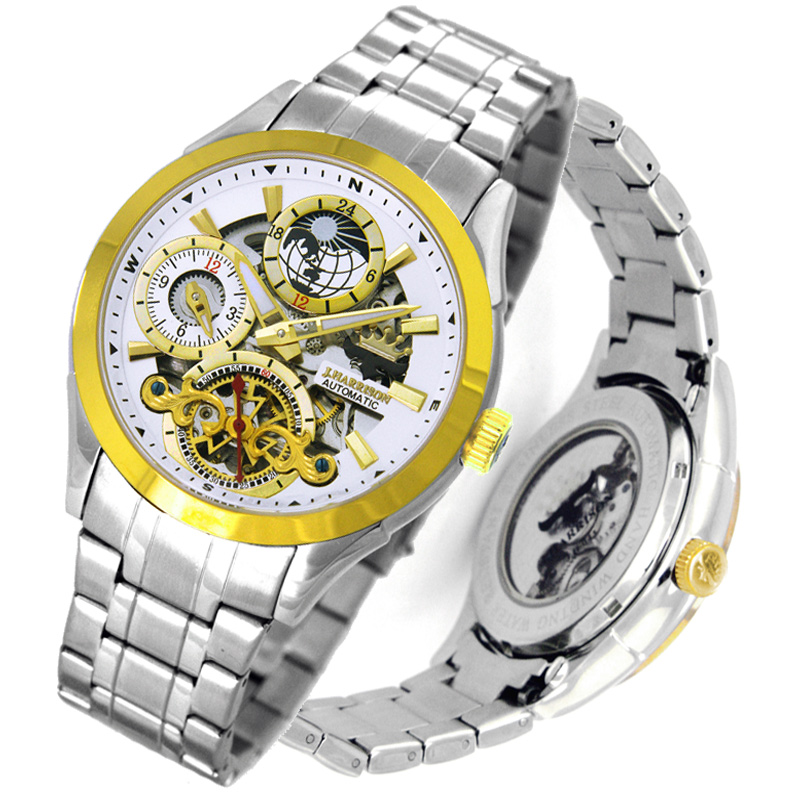 商品データ:縦50mm横47mm厚さ14mm 直径:42mm 腕回り長さ:最長220mm ベルト最短:150mm重さ:約156g、 商品素材:ケース:ステンレス ベルト:ステンレス ガラス:クリスタルガラス 裏キャップ:ステンレス&クリスタルガラス 商品機能: サン&ムーン、デュアルタイム、時、分表示。 付属品 専門ケース・保証書・取扱説明書 保証期間 1年間 生産国:中国