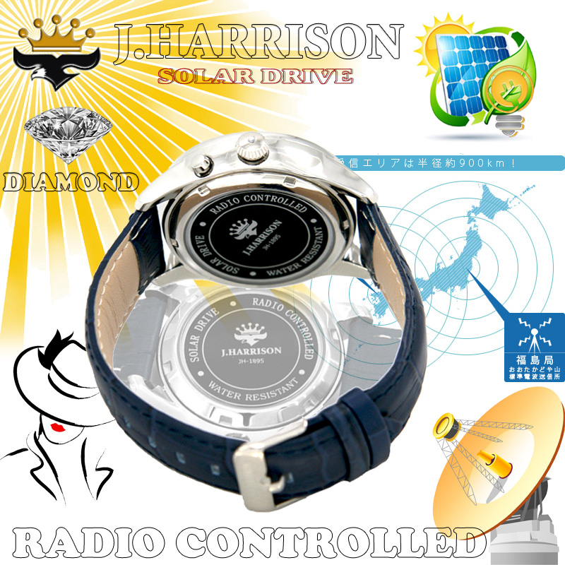 ソーラー電波 腕時計 標準電波を受信して自動で正確な時刻を刻んでくれる電波時計。            リューズに埋め込まれた天然ダイヤ(カボション)が高級感を上品に演出します。               ソーラーシステム搭載で面倒な電池交換も不要。 全国対応の電波ソーラー腕時計なので、 どこにいても正確な時刻に 自動修正、 面倒な時刻合わせが一切不要な電波ソーラー腕時計。 [仕様] あかり発電(ソーラー電源) 日常生活防水。 電波受信機能 定時受信、強制電波受信 電波受信電波: 長波(周波数40/60KHz)、 両局自動選局受信(1日最大3回) 高精度のアナログ表示機能を備えたソーラー駆動の電波時計。 全国対応の電波ウォッチなので、どこにいても正確な時刻に とってもエコで地球にやさしい腕時計です。