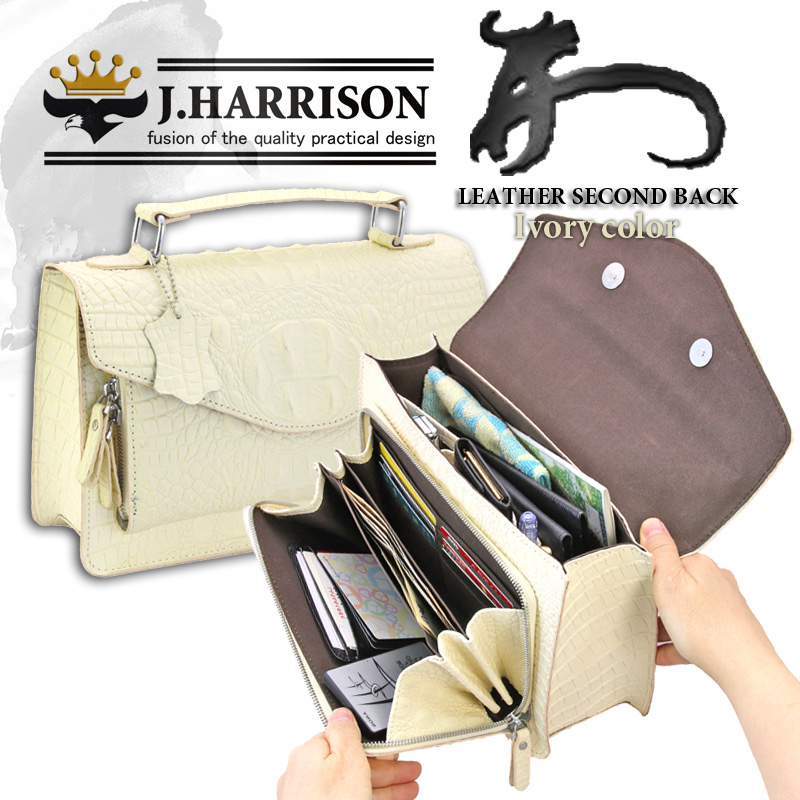 表側:牛革(床革)100%=クロコ型押し 内側:ポリエステル・綿 ●フラップ/ダブルマグネット(幅90㎜) ●前面ウォレット型多機能ポケット:フリーポケット×4・カードホルダー×6枚 ●内側:オープン(スマホ)ポケット×3 ペンホルダー×2 ●大容量の財布がそのままバッグに取り付けられたセカンドバッグ!