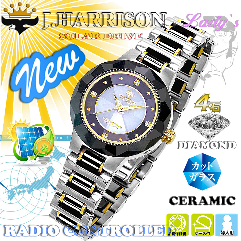 素材:●ムーブ/ソーラー充電+電波受信●風防:8面カットクリスタルガラス ●ケース・裏蓋・ベルト:ステンレス+セラミック ●留め金:ステンレス(Dバックル式) ●インデックスに天然ダイヤモンド×4石付き ●日常生活防水(3気圧)●月差/±30秒 ●1年間保証付き ●専用化粧箱入り ●品質保証書付