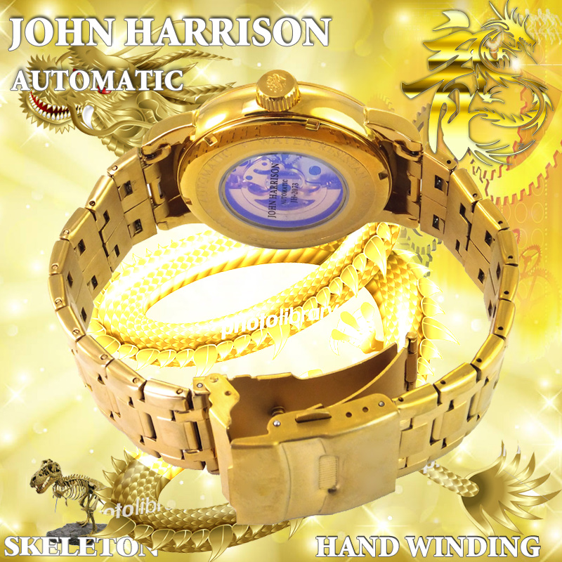全体的にゴールドを基調とした、ゴージャスな腕時計。中心にはダイナミックなドラゴン、スケルトンタイプで、時計の内部が見えるのもポイント。インデックスにはラインストーンが煌めき、アクセサリー感覚で着けでもオシャレ。