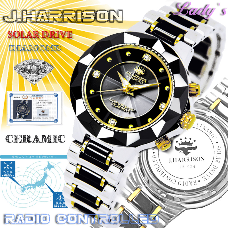 素材:●ムーブ/ソーラー充電+電波受信●風防:8面カットクリスタルガラス ●ケース・裏蓋・ベルト:ステンレス+セラミック ●留め金:ステンレス(Dバックル式) ●インデックスに天然ダイヤモンド×4石付き ●日常生活防水(3気圧)●月差/±30秒 ●1年間保証付き ●専用化粧箱入り ●宝石鑑別書付